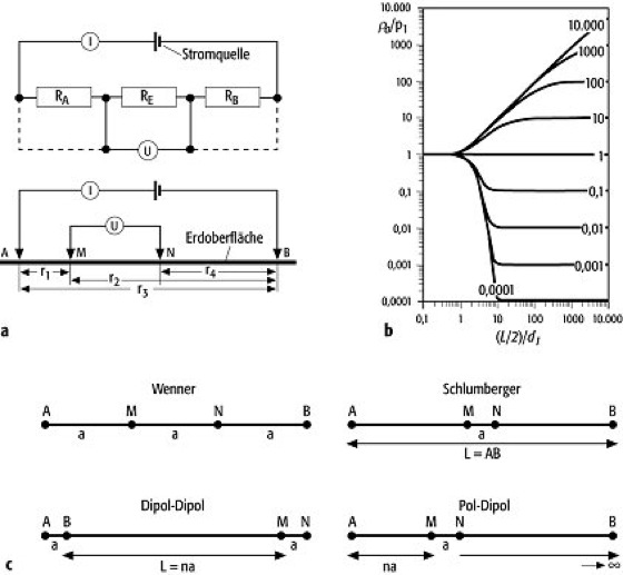 Gleichstromgeoelektrik 1: a) Ersatzschaltbild für die 2- und 4-Punkt-Anordnung. RA und RB sind die Übergangswiderstände an den Elektroden A und B, RE ist der Ohmsche Widerstand des Untergrunds. Darunter sind die geometrischen Verhältnisse in einer 4-Punkt-Anordnung dargestellt (M, N = Sonden zur Messung des Spannungsabfalls). b) gebräuchliche 4-Punkt-Anordnungen in der Gleichstromgeoelelektrik (a = jeweiliger Elektrodenabstand). c) geoelektrische Masterkurven für den 2-Schichtfall in der Schlumberger-Anordnung (Abszisse: halber Elektrodenabstand L/2 normiert auf Dicke d1 der Deckschicht, Ordinate: scheinbarer spezifischer Widerstand ρa normiert auf den spezifischen Widerstand ρ1 der Deckschicht). Als Parameter ist das Verhältnis ρ2/ρ1 (ρ2 = spezifischer Widerstand des Substrats) an den Kurven aufgetragen. Gleichstromgeoelektrik 1:
