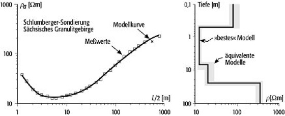 /2 ebenfalls doppelt-logarithmisch auf, erfordert dagegen nur ein gelegentliches Umsetzen der Potentialsonden (wenn die Größe des Spannungsabfalls unter die Meßgenauigkeit der Apparatur fällt), ist also weniger aufwendig. Allerdings kommt es bei einem Sondenversatz häufig zu einem Sprung in der scheinbaren Widerstandskurve aufgrund oberflächennaher Leitfähigkeitsanomalien (vergleichbar dem static shift in der Magnetotellurik), der schwer zu kontrollieren und meist nur mit ad-hoc-Annahmen zu korrigieren ist, etwa daß die Werte bei einer langen Auslage "richtiger" seien als bei einer kurzen Auslagenweite a = ![]()