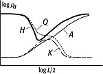 Gleichstromgeoelektrik 3: Kurvenformen geoelektrischer Tiefensondierungen bei einem 3-Schichtfall. H = gutleitende 2. Schicht (Minimumtyp) mit ρ1 > ρ2 ρ3, K = schlechtleitende 2. Schicht (Maximumtyp) mit ρ1 ρ2 > ρ3, A = ρ1 ρ2 ρ3, Q = ρ1 > ρ2 > ρ3, L = Elektrodenabstand, ρa = scheinbarer spezifischer Widerstand.