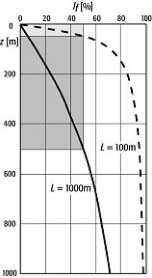 Gleichstromgeoelektrik 5: Verteilung des Stromes mit der Tiefe für Elektrodenauslagen von L = 100 m und L = 1000 m für einen homogenen Halbraum. Oberhalb der Tiefe z = L/2 (grau schraffierte Bereiche) fließen jeweils 50% des Gesamtstroms. Gleichstromgeoelektrik 5: