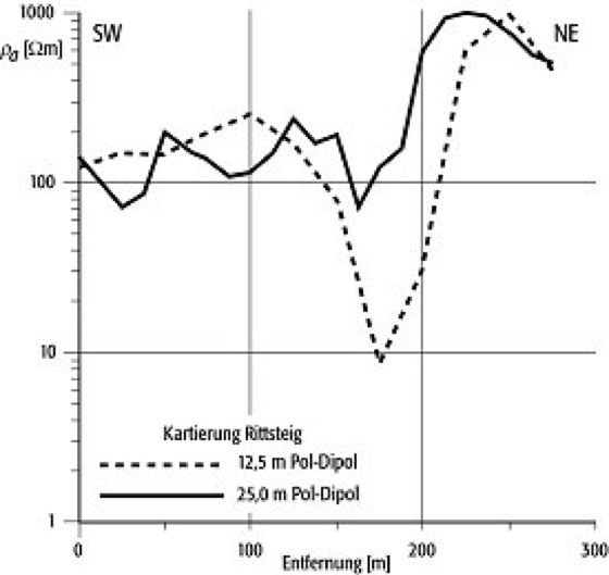 Gleichstromgeoelektrik 4: Pol-Dipol-Kartierung mit Sondenabstand 12,5 m bzw. 25,0 m an der Böhmischen Scherzone in Rittsteig (Böhmischer Wald). Das Minimum in den ρa-Kurven (ρa = scheinbarer spezifischer Widerstand) bildet eine nach Nordosten einfallende, graphitisierte Störungszone ab. Gleichstromgeoelektrik 4: