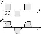 Gleichstromgeoelektrik 6: schematischer zeitlicher Verlauf eines gepulsten Gleichstroms (oben) und Verlauf der Spannung an den Sonden M, N (unten). Durch Aufladungseffekte im Untergrund wird das Maximum erst nach einer gewissen Zeit erreicht.