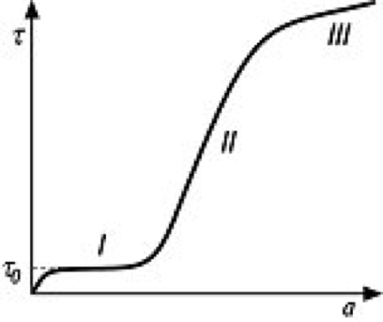 Gleitkurve: schematischer Verlauf der Schubspannung τ als Funktion der Abgleitung a. Mit τ0 ist die kritische Schubspannung, die zum Einsetzen von Gleitvorgängen notwendig ist, bezeichnet. Gleitkurve: