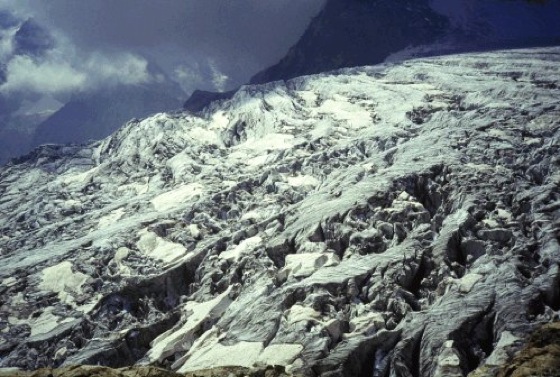 Gletscherbruch: oberer Bereich des Gletscherbruchs an einer Gefällsversteilung. Gletscherbruch: