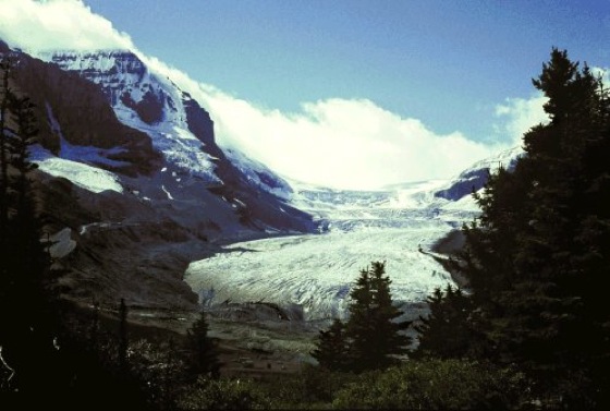 Gletscherrückgang: Beispiel für jungen Gletscherrückgang. An der Seitenmoräne auf der linken Bildseite ist deutlich die größere Gletscherausdehnung des Hochstandes aus der zweiten Hälfte des 19. Jh. zu erkennen (Athabasca-Gletscher, Alaska). Gletscherrückgang:
