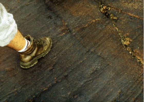 Gletscherschliff: Gletscherschliff auf einem Rundhöcker. Gut zu erkennen sind die polierte Oberfläche und die Gletscherschrammen, die Fließrichtung des Eises verlief parallel zum abgebildeten Schuh. Gletscherschliff: