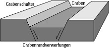 Graben, 1) relativ abgesunkenes langgestrecktes Krustensegment, das an den Längsseiten von gegeneinander geneigten Abschiebungen (Grabenrandverwerfungen) begrenzt wird ( Abb. ). Sofern der Graben nicht durch Abtragung der Grabenschultern eingeebnet wurde, bildet er morphologisch eine Senke (Dehnungstektonik). Durch Reliefumkehr kann ein tektonischer Graben jedoch auch einen Höhenzug bilden (z.B. Hohenzollern-Graben).