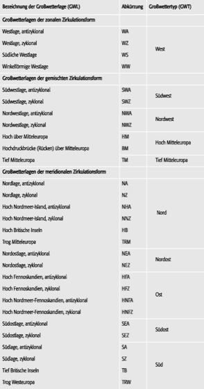 Großwetterlage (Tab.): Übersicht der Großwetterlagen-Klassifikation nach Hess und Brezowsky (1969), die den Kriterien vorherrschender Strömungsrichtung und Luftdruckkonstellation folgt. antizyklonal = Hochdruckeinfluß, zyklonal = Tiefdruckeinfluß. Großwetterlage (Tab.):