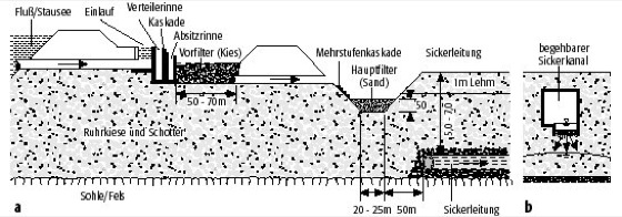 b) Sickerleitungen: Sie bestehen aus gelochten oder schlitzten Beton-, Kunststoff-, Stahl- und Steinzeugrohren mit Filterkiesumhüllung und werden in offener Baugrube auf der Sohle von geringmächtigen Grundwasserleiter mit kleinem Flurabstand (bis ca. 10 m) und in ufernahen Ablagerungen von Kiesen und Sanden entlang von Gewässern (z.B. im Ruhrtal) oder unterhalb von Versickerungsbecken und -gräben zur Gewinnung von uferfiltriertem und angereichertem Grundwasser verlegt ( Abb. a ). Es werden auch unterirdisch verlegte Sickerrohrleitungen ähnlicher Ausführung oder überdeckte (begehbare) Sickerkanäle ( Abb. b ) neben vertikalen Schluckbrunnen zur Infiltration von ggf. vorbehandeltem Anreicherungswasser in den Grundwasserleiter verwendet. Die bei zahlreichen Wasserwerken zur Grundwasseranreicherung betriebenen Versickerungsbecken (wegen ihrer langgestreckten Form häufig auch als Versickerungsgräben bezeichnet) werden in die aus Auelehm gebildete Deckschicht so tief eingeschnitten, daß ihre Sohle die Oberfläche des Grundwasserleiters erreicht. Die Beckensohle wird gemäß DIN 2000 mit einer als Langsamsandfilter wirkenden und nach Verstopfung abzuschälenden Sandschicht von 0,5-1,0 m Höhe abgedeckt. Beschickt werden sie mit einem flächenbezogenen Sickerwasserabluß von 0,5-2 Meter pro Tag.