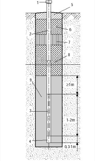 Grundwassermeßstelle: Ausbauplan von Grundwassermeßstellen im unbedeckten Grundwasserleiter (1 = Kappe, 2 = Aufsatzrohr, 3 = Filterrohr, 4 = Sumpfrohr, 5 = Betonabdeckung, 6 = frostsicherer Boden, 7 = Abdichtung, 8 = Bohrgut, 9 = Filtersand). Grundwassermeßstelle: