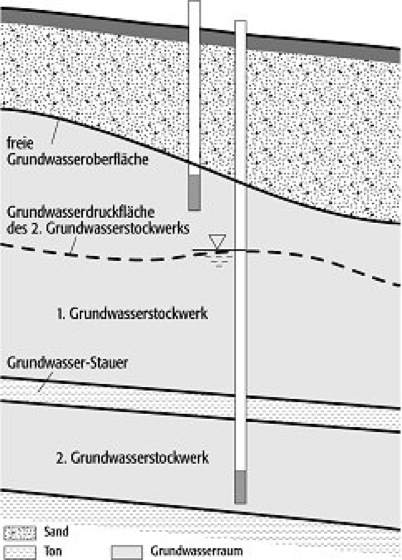 Grundwasserstockwerk: Auftreten von Grundwasser in mehreren Grundwasserstockwerken. Grundwasserstockwerk: