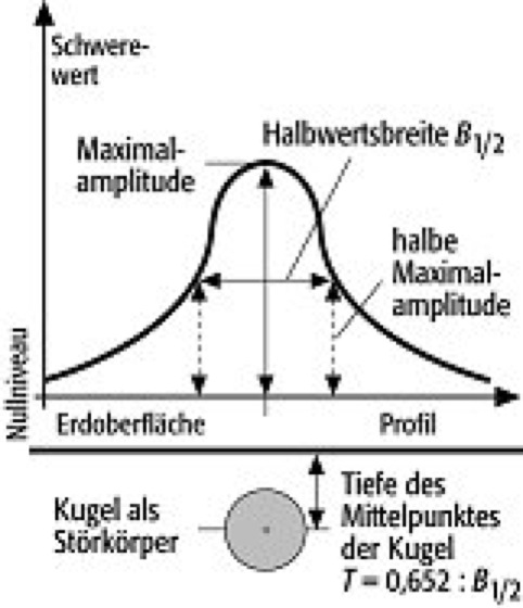 Halbwertsbreite, Begriff aus der Potentialtheorie. Trägt man z.B. längs eines Profils die gemessenen Schwerewerte auf und legt eine zur Profilachse parallele Gerade durch den halben Wert des Extremwertes der Anomalie, so ergibt sich die Halbwertsbreite (gemessen auf der Profilachse) aus den beiden Schnittpunkten der Geraden mit der Meßkurve. Aus der Halbwertsbreite lassen sich Abschätzungen über die Tiefenlage des Mittelpunktes bzw. des Schwerpunktes des Störkörpers machen. Generell gilt, daß sich mit zunehmender Halbwertsbreite auch die Tiefenlage des verursachenden Störkörpers vergrößert ( Abb. ). Der Begriff der Halbwertsbreite läßt sich auch auf flächenhafte Darstellungen übertragen.