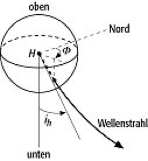 Herdflächenlösung: Herdkugel mit dem Hypozentrum des Erdbebens als Zentrum. Der Durchstoßpunkt des seismischen Strahls durch die Herdkugel wird durch Azimut Φ und Abstrahlwinkel ih angegeben. Herdflächenlösung: