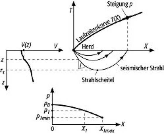 Die obigen Formeln gelten für ebene Schichtung. Man kann sie leicht auf kugelförmige Schichtung erweitern, indem man folgende Substitutionen vornimmt: X(p) durch RE·Δ(p) (Δ = Herdentfernung in Winkelgrad), Tiefe z durch RE·ln(RE/R) und Geschwindigkeit V(z) durch V(z)·ln(RE/R) ersetzen. Man geht in der Inversion so vor, daß man x1 in kleinen Schritten von der Xmin (für den bei Xmin auftauchenden Strahl muß die Geschwindigkeit in der Scheiteltiefe bekannt sein) bis Xmax erhöht. Für jedes x1 läßt sich die Scheiteltiefe z1 durch Integration der Gleichung (1) zwischen p1 und p0 sowie die zugehörige Geschwindigkeit aus Gleichung (2) ermitteln. Damit ergibt sich die Geschwindigkeits-Tiefen-Funktion bis zu der Tiefe, die der Scheiteltiefe des Strahls entspricht, der in der Maximalentfernung Xmax auftaucht.