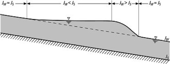Hochwasserwelle: Längsschnitt durch eine Hochwasserwelle (Jw = Wasserspiegelgefälle, Js = Sohlgefälle). Hochwasserwelle: