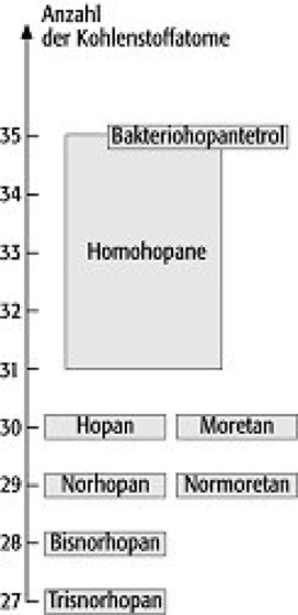 Hopanoide, hopanoide Kohlenwasserstoffe, pentacyclische Terpane mit vier Cyclohexanringen (Ring A-D) und einem Cyclopentanring (Ring E), Derivate des Hopans und der Homohopane. Ursprungssubstanz für die Hopanoiden ist das C35-Bakteriohopantetrol ( Abb. 1 ). Die Verbindungen mit der 17β, 21α-Konfiguration werden als Moretane bezeichnet. Durch Biodegradation wird durch Verlust der C-25-Methylgruppe aus dem Hopan das 29 Kohlenstoffatome zählende Norhopan gebildet. Durch Verlust der Methylgruppe am C-28- und C-30-Position wird aus dem Hopan das 17α-28, 30-Bisnorhopan (BNH), bei dem zusätzlichen Verlust der C-25-Methylgruppe das 17α-25, 28, 30-Trisnorhopan (TNH). Weiterhin existieren zwei weitere im Erdöl enthaltene hopanoide Verbindungen mit 27 Kohlenstoffatomen, das 17α-22, 29, 30-Trisnorhopan (Tm) und das 18α-22, 29, 30-Trisnorneohopan (Ts) ( Abb. 2 ). [SB]