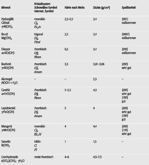 Die Mehrzahl der Hydroxide, bei denen die OH-Gruppe vollständig oder teilweise die Sauerstoffionen der Oxide ersetzt, kristallisiert in Schichtgittern. Meist handelt es sich um hexagonal dichteste Packungen von OH-Ionen, woraus sich gemeinsame Eigenschaften der Hydroxide, wie z.B. eine meist vollkommene Spaltbarkeit zwischen den Schichten und eine geringe Härte, erklären. Oxide.