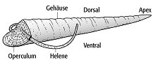 Hyolithen, eine mutmaßlich zu den Molluska gehörende, paläozoische Tiergruppe unsicherer systematischer Stellung mit Blütezeit im Kambrium ( Abb. ). Sie besitzen konische, vermutlich ursprünglich aragonitische Kalkgehäuse, 0,1-50 mm lang, z.T. im Anfangsteil gekammert, im Querschnitt oft dreieckig bis oval abgeflacht und am Apex geschlossen. Die Mündung ist von einem Operculum verschlossen. Gelegentlich weisen Hyolithen von der Innenseite des Operculums zwei sichelförmige, zum Apex gerichtete Anhänge auf. Hyolithen gehören zum marinen Benthos.
