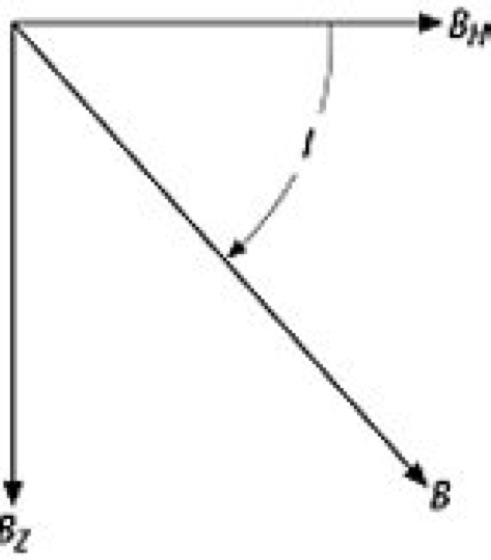 Inklination, ist der Winkel I zwischen der lokalen Richtung der Horizontalkomponente BH und der Vertikalkomponente BZ des Erdmagnetfeldes B, bei nach unten zeigender Feldrichtung positiv gerechnet ( Abb. ). Bei horizontaler Feldrichtung ist I = 0°, bei vertikaler Feldrichtung ist I = ±90°. In Mitteleuropa ist I ≈ +60°.