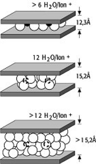 Das am weitesten verbreitete Tonmineral mit innerkristalliner Quellung ist der Montmorillonit. Bei einem trockenen Montmorillonit liegen die Silicatschichten so dicht aufeinander, daß sie sich bei einem Schichtabstand von 9,6-10 Å fast berühren. Bei Kontakt mit Wasser hydratisieren die Zwischenschichtkationen. In Abhängigkeit vom herrschenden Partialdruck und vom Elektrolytgehalt werden ein (12,3 Å), zwei (15,2 Å) und vier ( > 15,2 Å) Wasserschichten ausgebildet ( Abb. ). Dabei bleibt die kristalline Ordnung weitestgehend erhalten. In Wasser oder elektrolytarmen Systemen können wesentlich mehr als vier Schichten ausgebildet werden. Der Schichtabstand kann über 20 Å steigen und die kristalline Ordnung geht verloren. [CSch]
