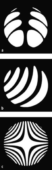 Interferenzbilder 1: Interferenzbilder optisch einachsiger Kristalle verschiedener Schnittlage, Dicke und Doppelbrechung im monochromatischen Licht: a) kristalloptische Achse ca. 45º zur Präparatebene geneigt, b) kristalloptische Achse ca. 70º zur Präparatebene geneigt, c) kristalloptische Achse parallel zur Präparationsebene. Interferenzbilder 1: