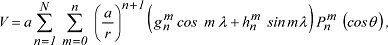 wobei a = 6371,2 km den mittleren Erdradius bezeichnet, r = radialer Abstand vom Erdzentrum, λ = geographische Länge östlich von Greenwich und θ = geozentrischer Polabstand (λ = 90º-φ, φ = geographische Breite). Pnm ist die zugeordnete Kugelfunktion (associated legendre function) vom Grad n und der Ordnung m in der Quasinormierung nach A. Schmidt. Als IGRF zu einer bestimmten Epoche stehen die Gaußschen Koeffizienten gnm, hnm sowie deren säkulare Änderungen/Jahr zur Verfügung. Diese Koeffizienten beziehen sich auf die Erdoberfläche, die als Rotationsellipsoid mit einem äquatorialen Radius von 6378,160 km und einer Abplattung von 1/298,25 angenommen ist. Die Säkularvariationskoeffizienten dienen der linearen Vorwärtsinterpolation bis zum nächsten IGRF. Die Neuberechnung des Referenzfeldes (tatsächliche Säkularvariation) wird mit DGRF (definite) bezeichnet. Ab 1900 stehen in Intervallen von je fünf Jahren autorisierte IGRF bzw. DGRF zur Verfügung, auf die u.a. globale bzw. regionale Anomalienfelder bezogen werden. Mit den publizierten Gaußschen Koeffizienten lassen sich die Vektorfeldkomponenten für jeden Punkt der Erdoberfläche berechnen und beispielsweise in einer Isolinienkarten darstellen. [VH, WWe]