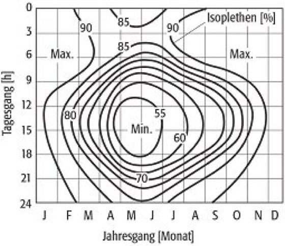 Isoplethen: Isoplethen der mittleren relativen Luftfeuchtigkeit in Uppsala. Isoplethen:
