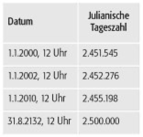 Julianische Tageszählung (Tab.): Beispiele für Daten mit Julianischer Tageszahl. Julianische Tageszählung (Tab.):