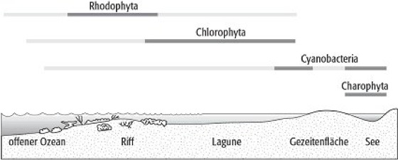 Kalkalgen, eine informelle Fossilgruppe, in der alle benthischen Algen, inklusive der Cyanobakterien, zusammengefaßt werden, die infolge ihrer Lebenstätigkeit zumindest eine partielle kalkige Hülle oder ein kalkiges Skelett ausscheiden. Kalkalgen sind im gesamten Phanerozoikum divers und in flachmarinen und nicht marinen aquatischen Lebensräumen häufig ( Abb. 4 ). Sie haben eingeschränkten biostratigraphischen Leitwert. Ihr besonderer Wert liegt in der paläoökologischen Aussagekraft der diversen Gruppen ( Abb. 1 , 2 u. 3 ). Generell sind sie als Faziesanzeiger für Salinität, Temperatur und Wassertiefe nutzbar. In flachmarinen Sedimentationsräumen sind sie als Lieferant von Bioklasten, manche Gruppen nach ihrem postmortalem Zerfall auch als Mikritproduzenten von Bedeutung. Kalkalgen beteiligen sich als sedimentbindende und -fangende Organismen (Binder und Baffler) an verschiedensten Biokonstruktionen quer durch die Erdgeschichte.