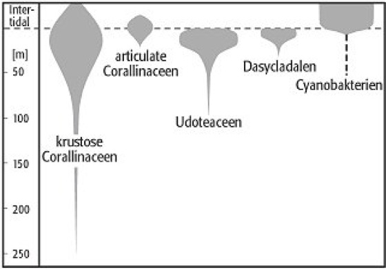 Kalkalgen 1: Verbreitung rezenter benthischer Kalkalgengruppen auf einem idealisierten Profil eines tropischen Carbonatschelfs. Kalkalgen 1: