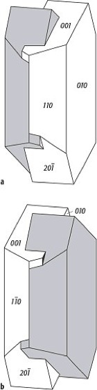 Karlsbader Gesetz, Zwillingsbildung (Zwilling) bei Orthoklas (Feldspäte) mit der Zwillingsachse [001] (Karlsbader Zwillinge). Die Verwachsung ( Abb. ) erfolgt meist parallel der Fläche b [010] unter teilweiser Durchdringung der beiden Individuen (linke und rechte Zwillinge).