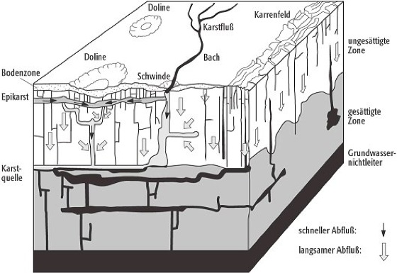 Karstgrundwasserleiter, Karstaquifer, ein verkarsteter Gesteinskörper, dessen Durchlässigkeitseigenschaften wesentlich durch Lösungshohlräume wie erweiterte Trennfugen, Karstspalten und Karströhren bestimmt werden ( Abb. ). Karstgrundwasserleiter zeichnen sich i.a. durch hohe Transmissivitäten sowie raschen Abfluß entlang der bevorzugten Wegsamkeiten ab. Diese vergleichsweise hohen Abflußgeschwindigkeiten sowie die weiten Öffnungsquerschnitte der Karstkanäle und der Karströhren haben eine nur geringe Selbstreinigungswirkung während der Untergrundpassage zur Folge. Karstgrundwässer wie auch der Grundwasserleiter selbst sind daher sehr empfindlich gegen den Eintrag von Schadstoffen.