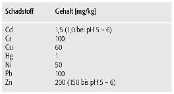 Klärschlammverordnung (Tab.): Schwermetallgrenzwerte nach AbfKlärV. Klärschlammverordnung (Tab.):