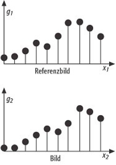 Kleinste-Quadrate-Bildzuordnung, Verfahren der flächenbasierten Bildzuordnung. Ziel der Zuordnung ist das Auffinden und Zuordnen homologer Intensitätsverteilungen (Flächen) in einem digitalen Bild und einem Referenzbild durch eine radiometrische und geometrische Transformation der diskreten Intensitätswerte. Zielfunktion ist die Minimierung der Summe der Quadrate der Intensitätsdifferenzen (g1(i)-g2(i))2 nach der Methode der kleinsten Quadrate. Voraussetzung für die Lösbarkeit der Aufgabe sind gute Näherungswerte für die gesuchten Parameter der geometrischen Zuordnung. Das funktionale Modell der geometrischen Transformation x1 = f(x1) ist in der Regel eine Affintransformation. Bei der radiometrischen Transformation werden konstante Helligkeits- und Kontrastunterschiede r1 und r2 zwischen den Bildausschnitten berücksichtigt. Für die Zuordnung der Grauwerte in einer Geraden (z.B. in einem Kernstrahl) gelten damit die linearen Beziehungen: