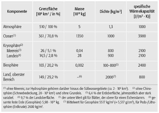 Klimasystem (Tab.): quantitativer Vergleich der Komponenten des Klimasystems. Klimasystem (Tab.):