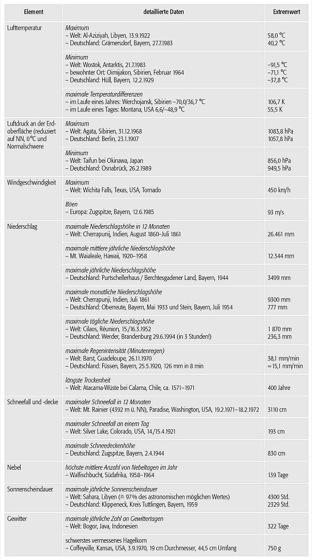 klimatologische Extremwerte (Tab.): Zusammenstellung einiger absoluter klimatologischer Extremwerte, beruhend auf Messungen des 20. Jahrhunderts. klimatologische Extremwerte (Tab.):