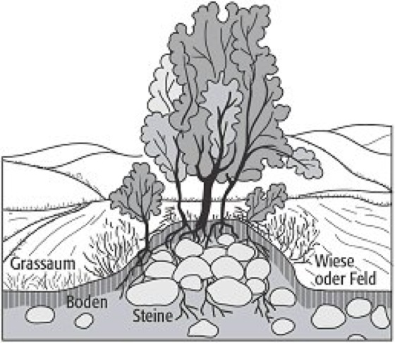Knick, Wallhecke, Sonderform der Hecke, die charakteristisch ist für gewisse Landschaftstypen West- und Nordwesteuropas, v.a. in Schleswig-Holstein. Knicke sind aufgebaut aus aufeinander geschichteten, groben Steinen, die mit Erde bedeckt sind (Erd- und Lesesteinwälle) und auf denen heckenbildende Gehölze wachsen. Sie dienen sowohl der Abgrenzung des Eigentums als auch dem Windschutz ( Abb. ). Der Knick erfüllt vielfältige ökologische Funktionen in den Agrarlandschaften, insbesondere als Rückzugs- und Lebensstätte verschiedener Tiere.