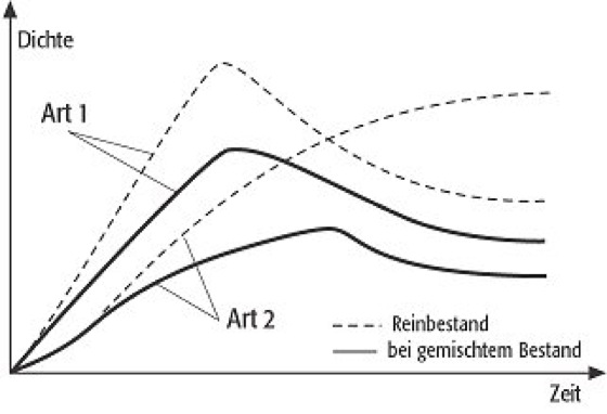 Koexistenz: Für die verglichenen Kleearten (Trifolium) sind die Wachstumskurven reiner und gemischter Bestände dargestellt. Von beiden Arten wächst T. repens (Art 1) schneller und erreicht die größere Blattdichte, T. fragiferum (Art 2) hat dagegen längere Stiele und ist in der Lage, die schneller wachsende Art zu überragen. Beide können daher in einer Mischkultur nebeneinander existieren, wenngleich sie unter diesen Umständen eine geringere Blattdichte aufweisen als in Reinkultur. Koexistenz: