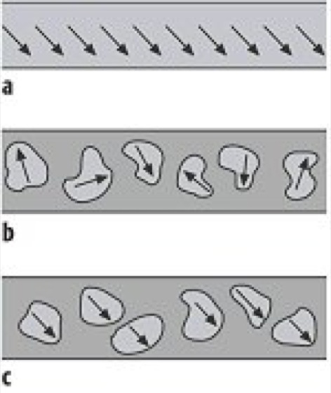 Konglomerat-Test: a) Magnetisierung in einer Schicht des Muttergesteins, b) positiver und c) negativer Konglomerat-Test. Konglomerat-Test: