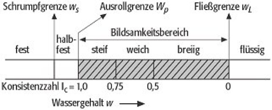 Konsistenzbalken, graphische Darstellung nach Atterberg, die einen Vergleich des natürlichen Wassergehaltes eines Bodens mit dessen Wassergehalten an der Fließgrenze und Ausrollgrenze und damit die Bestimmung seiner Konsistenz ermöglicht ( Abb. ). Je nach Lage des Wassergehaltes bzw. der Konsistenzzahl (Konsistenzermittlung) wird der Boden als breiig, weich oder steif angesprochen.
