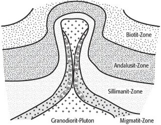 Kontaktmetamorphose 1: schematischer Schnitt durch die Kontaktaureole eines Granodiorit-Plutons mit vier verschiedenen Zonen in dem pelitischen Nebengestein. Kontaktmetamorphose 1: