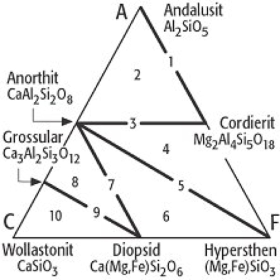 Kontaktmetamorphose 2: ACF-Diagramm der Pyroxen-Hornfelsfazies mit den Mineralparagenesen der zehn Hornfelsklassen, die von V.M. Goldschmidt im Oslo-Gebiet beobachtet wurden. Kontaktmetamorphose 2: