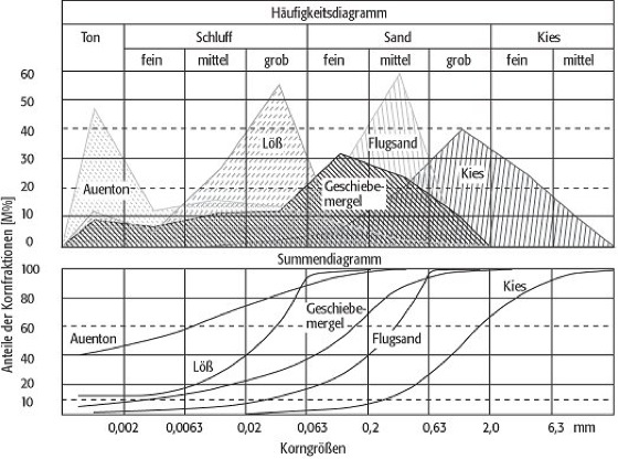 Korngrößenverteilung: Kornhäufigkeitsverteilung und Kornsummenkurve ausgewählter Böden. Korngrößenverteilung: