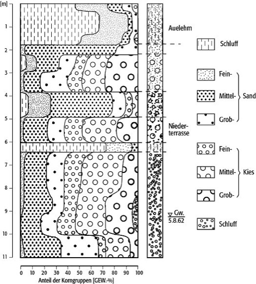 Korngruppendiagramm: Korngruppendiagramm für eine Bohrung in Niederterrassensedimenten des Rheins. Korngruppendiagramm: