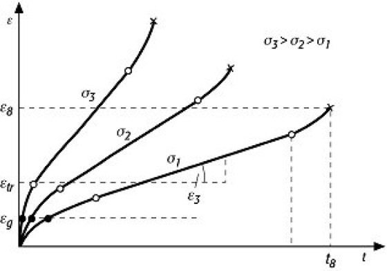 Kriechkurve: Dehnung als Funktion der Zeit für verschiedene Spannungen σ. Kriechkurve: