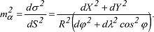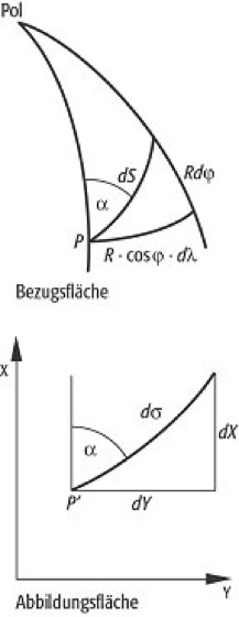 Längenverzerrung, das Verhältnis mα einer differentiellen Strecke dσ auf der Abbildungsfläche (Karte) zu der entsprechenden differentiellen Strecke dS auf der Bezugsfläche (Kugel oder Ellipsoid). Die Längenverzerrung ist eine Maßstabszahl, die im allgemeinen von einem Punkt P' der Karte mit den Koordinaten X und Y aus in allen Richtungen α einen anderen Wert annimmt. In dem Sonderfall mα = const. spricht man von einer konformen Abbildung. Der mathematische Ausdruck für die Längenverzerrung bei Verwendung der Kugel als Bezugsfläche ergibt sich aus den differentiellen Ausschnitten aus Bezugs- und Abbildungsfläche ( Abb. ) zu: