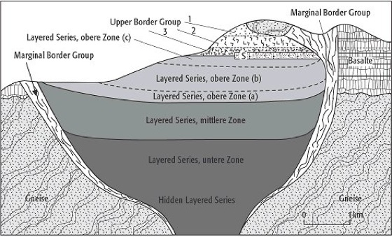 Lagenintrusion, layered intrusion, großer (einige km bis mehrere 100 km Durchmesser und bis zu 8 km mächtiger) magmatischer Körper, in dem sich die Kristallakkumulation in einer Magmakammer studieren läßt. Lagenintrusionen können sich beim Auseinanderbrechen von Kontinenten bilden (z.B. Skaergaard in Grönland, Abb. ) oder auch als Folge von Meteoriteneinschlägen (Sudbury in Kanada). Charakteristisch ist der Aufbau aus sich vielfach wiederholenden, zentimeter- bis metermächtigen Lagen aus einem oder wenigen Kumulus- und Interkumulusmineralen (Kumulatgefüge). Zu diesen gehören insbesondere Olivin, Pyroxene, Plagioklase, Chromit und Magnetit. Mit diesem rhythmischen Lagenbau (rhythmic layering) einher geht oft ein kryptischer Lagenbau (cryptic layering), erkennbar an sich monoton ändernder chemischer Zusammensetzung der Minerale innerhalb einer Lage (bei Olivinen und Pyroxenen verringert sich mit zunehmender Differenzierung das Mg/(Mg+Fe)-Verhältnis, bei Plagioklasen das Ca/(Ca+Na)-Verhältnis) und plötzlichem Wiederanstieg dieser Verhältnisse, der durch die Zufuhr von undifferenziertem Magma verursacht wird. Wenn der Nachschub frischen Magmas endet, wird das verbleibende Magma vollständig kristallisieren. Dabei kommt es nahe des Dachs der Magmakammer zu extremer Differenzierung bis zur Bildung granitoider Schmelzen aus einem tholeiitischen Ausgangsmagma. Als Ursache des Lagenbaus wurde früher gravitative Kristallisationsdifferentiation angenommen. Neuere Modelle sind komplexer und schließen In-situ-Kristallisation, durch Diffusion und durch die Reaktionskinetik bestimmte Kristallisation und deren Verzögerung in einem turbulent konvektierenden Magma ein. [HGS]