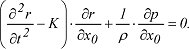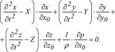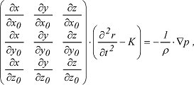 wobei ∇p = grad p = ∂p/∂k das Druckpotential ist. Die drei Gleichungen enthalten mit den Bahnkoordinaten (x, y, z) und dem Druck p vier Unbekannte, weshalb zur Lösung eine vierte Gleichung nötig ist. Dazu läßt sich das Kontinuitätsgesetz heranziehen. [WB]