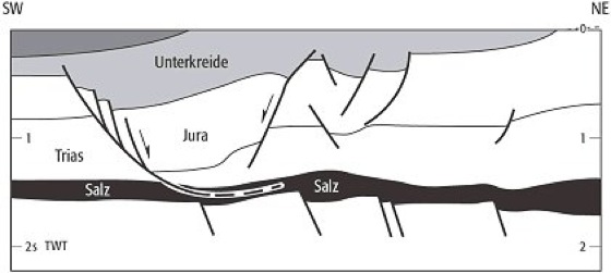 listrische Fläche: listrische Abschiebung mit Abscherhorizont in Salz, südliche Nordsee (geologische Interpretation). listrische Fläche: