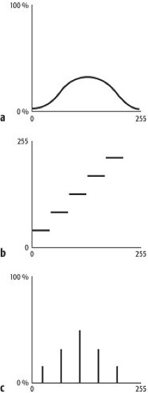 Look-up-Tabelle: Reduzierung der Grauwerte über Äquidensiten: a) Grauwertverteilung eines Eingabebildes, b) Look-up-Table zur Grauwertreduktion, c) Histogramm des Ausgabebildes. Look-up-Tabelle: